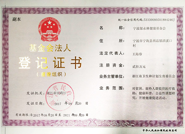 宁波邬永林健康基金会,成立于2010年10月,是在浙江省民政厅注册、由浙江省卫生健康委主管的非公募基金会。基金会的原始基金数额为人民币贰佰万元,来源于开云网页版。《慈善法》颁布后,本基金会被认定为慈善组织。